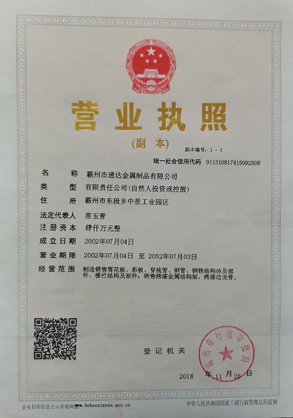 河北省霸州市通達(dá)金屬制品有限公司是一家生產(chǎn)熱鍍鋅管<預(yù)鍍鋅管>及熱鍍鋅板帶的生產(chǎn)企業(yè)。公司具有很強(qiáng)的經(jīng)濟(jì)實(shí)力。本公司地理位置優(yōu)越,交通便利,處于京津保滄四大城市交匯中心的勝芳鎮(zhèn)。由于公司不斷發(fā)展壯大,良好的投資環(huán)境為我公司的發(fā)展提供了可靠的保障。本公司是河北省重合同守信用企業(yè),被評(píng)為AAA級(jí)信用企業(yè)。