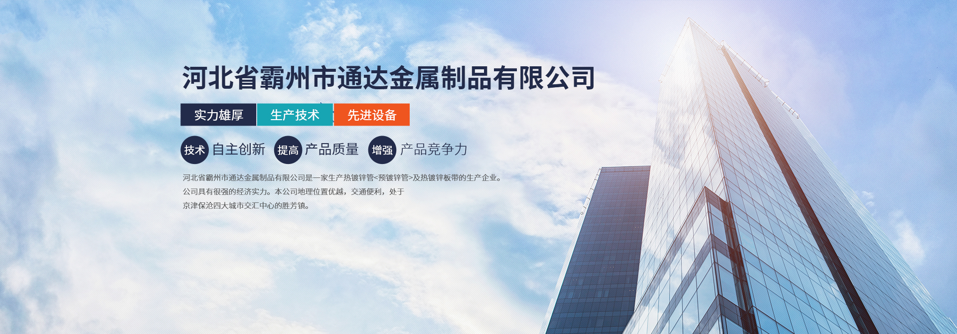 • 河北省霸州市通達(dá)金屬制品有限公司是一家生產(chǎn)熱鍍鋅管<預(yù)鍍鋅管>及熱鍍鋅板帶的生產(chǎn)企業(yè)。公司具有很強(qiáng)的經(jīng)濟(jì)實(shí)力。本 公司地理位置優(yōu)越,交通便利,處于京津保滄四大城市交匯中心的勝芳鎮(zhèn)。由于公司不斷發(fā)展壯大,良好的投資環(huán)境為我公司的發(fā)展提供了可靠的保障。本公司是河北省重合同守信用企業(yè),被評(píng)為AAA級(jí)信用企業(yè)